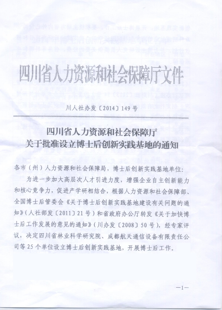 公司于2014年6月30日獲得四川省人力資源和社會保障廳批準(zhǔn)的博士后創(chuàng)新實(shí)踐基地。