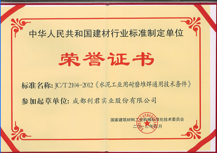 我公司榮獲“中華人民共和國建材行業(yè)標(biāo)準(zhǔn)制定單位榮譽(yù)證書”、常務(wù)副總經(jīng)理徐智平先生獲得“JCT2104-2012《水泥工業(yè)用耐磨堆焊通用技術(shù)條件》行業(yè)標(biāo)準(zhǔn)起草人榮譽(yù)證書”、項(xiàng)目經(jīng)理鄧四文先生被評(píng)為2012年度建材機(jī)械行業(yè)標(biāo)準(zhǔn)化先進(jìn)工作者。