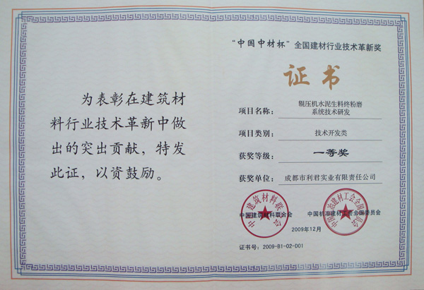 由“中國(guó)建筑材料聯(lián)合會(huì)”和“中國(guó)機(jī)冶建材全國(guó)委員會(huì)”舉辦的“中國(guó)中材杯”全國(guó)建材行業(yè)技術(shù)革新獎(jiǎng)評(píng)比中,我公司“輥壓機(jī)水泥生料終粉磨系統(tǒng)技術(shù)研發(fā)項(xiàng)目”榮獲一等獎(jiǎng)。12月19日公司派代表前往人民大會(huì)堂參加頒獎(jiǎng)儀式。